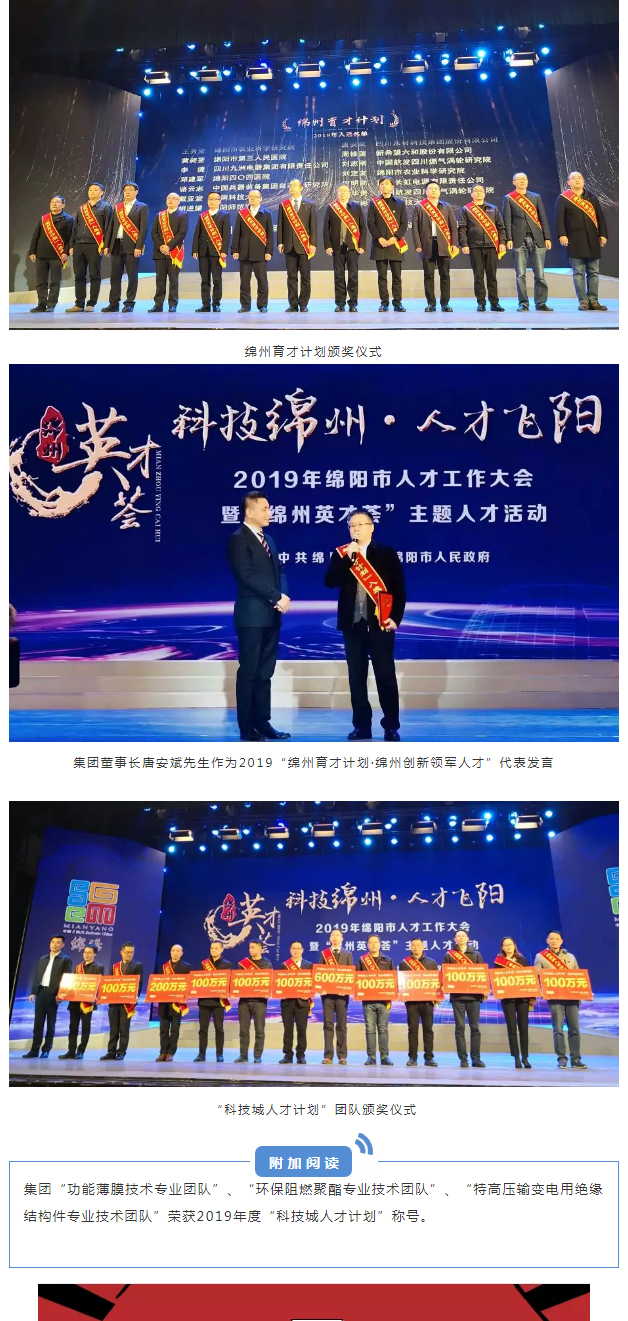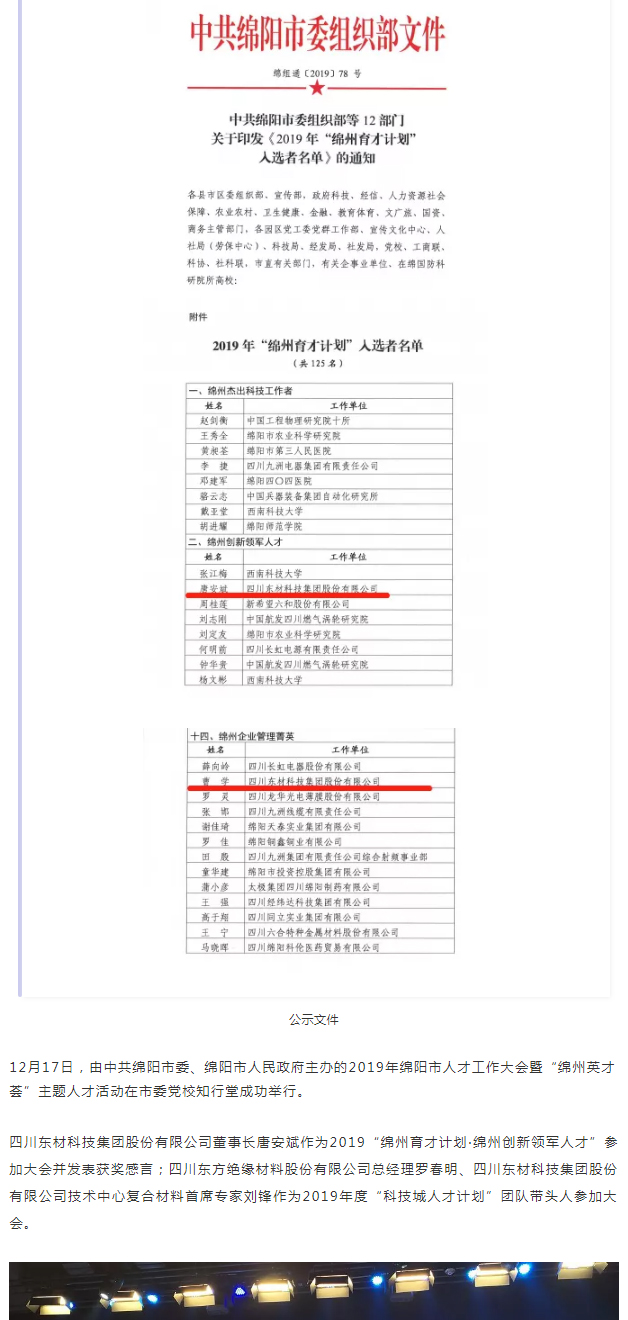 12月10日,綿陽市市委組織部等12部門聯合發布《關于印發2019年“綿州育才計劃”入選者名單的通知》(綿組通〔2019〕78號),公示了14類125名入選者名單公司董事長唐安斌成功入選2019“綿州育才計劃·綿州創新領軍人才”, 總經理曹學成功入選2019年“綿州育才計劃·綿州企業管理菁英”。