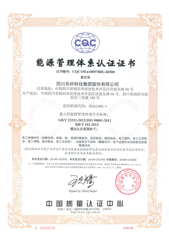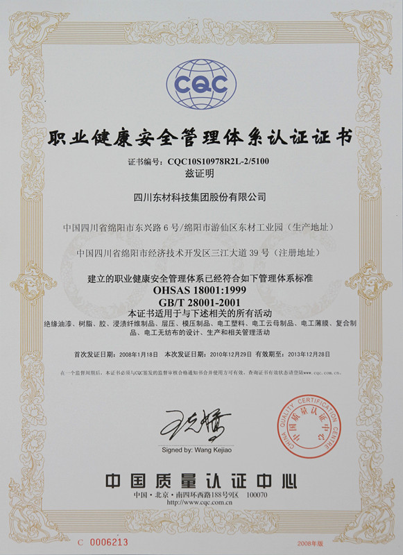 東材科技在國內同行業企業當中率先通過國際ISO9001的質量體系認證,通過ISO10012國際計量體系、ISO14001環境管理認證體系、OHSAS18001職業健康安全體系、GBT 29490知識產權管理體系、GBT23331能源管理體系認證企業、IATF16949汽車質量管理體系認證,不僅使公司產品質量保障體系達到國際化的新標準,而且為產品質量的穩定提供了強有力的保障。